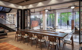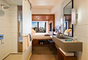 At 94,000 sf, the 11-story hotel has 325 micro-rooms with an emphasis on efficient but luxurious design and knee-to-ceiling, full-width windows. Additionally, the hotel offers expansive common areas and several food and beverage outlets, including a restaurant and rooftop bar with views of the Hudson River, managed by acclaimed chef Harold Moore.